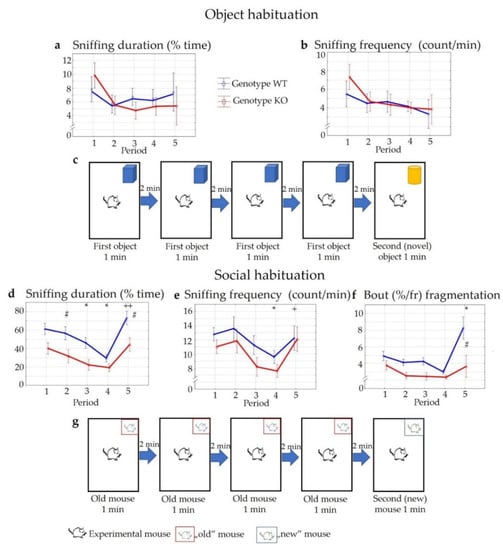 No significant differences were detected in the duration or frequency of sniffing during the object habituation–dishabituation trial within or between the groups (duration: Ftime (4,40) = 1.17, p > 0.33; Fgenotype (1,10) = 0.32, p > 0.58; Finteraction (4,40) = 0.46, p > 0.76 and frequency: Ftime (4,40) = 2.00, p > 0.11; Fgenotype (1,10) = 0.17, p > 0.68; Finteraction (4,40) = 0.32, p > 0.86), either when the same object was presented repeatedly, or when a new object was introduced (Figure 7a,b).