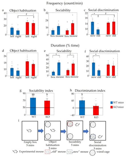 During the sociability (third) phase, all animals showed a higher duration of interest towards the social stimulus (first stimulus mice) (Feffect of choice (1,10) = 21.23, p < 0.01], without significant differences between the two genotypes (Fgenotype (1,10) = 0.07, p > 0.79; Finteraction (1,10) = 0.65, p < 0.43). Moreover, there was no significant difference in the frequency of interest between the two genotypes (Fgenotype (1,10) = 0.41, p > 0.53; Finteraction (1,10) = 0.59, p > 0.45), although the main effect of choice was significant (Feffect of choice (1,10) = 9.24, p < 0.02; in a post hoc comparison pWT > 0.13 and pKO > 0.08) (Figure 8b,e). A single sample t-test showed a remarkable social interest in the sociability index of both groups (tWT (1,4) = 6.70, p < 0.01; tKO (1,6) = 2.98, p < 0.05) when compared to the 50% chance level (Figure 8g).