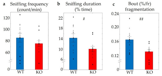 Results of the social interaction test. No differences were detected in the frequency of social behaviour between the two genotypes (a); however, a decreased duration of sniffing (b) and bout fragmentation (c) were detected in KO mice. n = 12 in both groups, the symbol # shows a significant difference, in cases with # p < 0.05, and ## p < 0.01. Blank triangles represent individual values while dark spots show outliers (characterized by a higher or lower value than mean ± 2 standard deviation (SD)).
