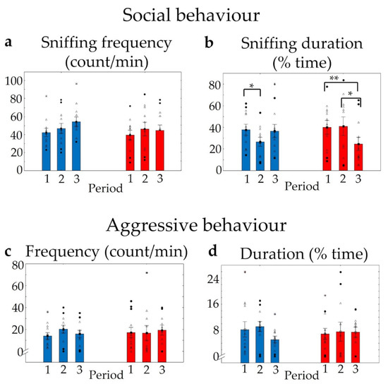 Results of resident–intruder trials. Numbers 1,2,3 represent 10 min trials 1 week apart. No significant differences were found in the frequency of social behaviour between the two genotypes (a). The duration of sniffing decreased significantly in both groups during the subsequent trials, although relevant temporal differences were detectable only in KOs (b). Neither the frequency nor the duration of aggressive interactions were significantly altered by time or by genotype (c,d). n = 12 in both groups, * p < 0.05 and ** p < 0.01 show a significant difference between repeated trials in the same group. Blank triangles represent individual values while dark spots show outliers (characterized by a higher or lower value than mean ± 2 standard deviation (SD)).