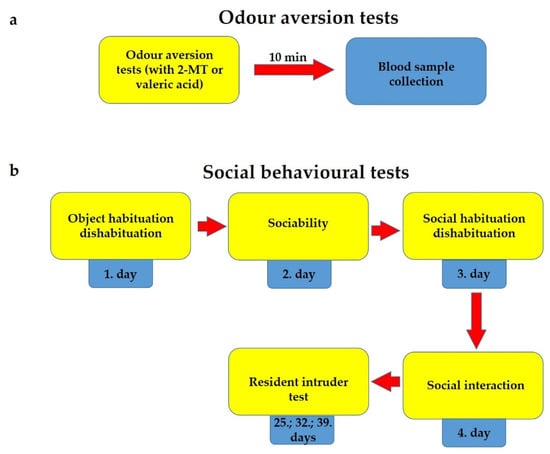 The experiment was performed in a transparent box located in a sound-attenuated room within a hood with a camera above the box. In the corner of the box a tube was fixed, containing a filter paper scented with 2-MT (Sigma-Aldrich, Cat. No.: 2346-00-1) or valeric acid (Merck, Sigma Aldrich GmbH, Schnelldorf, Germany, Cat. No.: 800821). The substances were diluted with saline (50 μL to 2 mL) and a 50 μL sample was used for each animal. The mice were allowed to freely explore the arena for 10 min. The boxes were cleaned with ethanol between animals and the odour was refreshed using a new filter paper and odour. Right at the end of this trial, animals were sacrificed, blood was collected into prechilled tubes, and the samples were centrifuged at 3000 rpm for 5 min. Supernatant serum samples were collected and stored at −20 °C for ACTH and corticosterone radioimmunoassay experiments (Figure 11).
