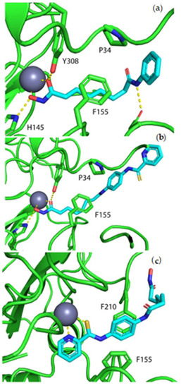 To validate the results from HDAC inhibition assays, molecular docking was conducted. The crystal structure of SAHA complexed with HDAC2 (PDB ID: 4LXZ) shows the hydroxamate coordinated to the zinc ion [26]. The hydroxamate coordination is stabilized by hydrogen bonding to histidine-146 and tyrosine-306. Hydrophobic interactions occur between the phenyl ring of phenylalanine-155 and the aliphatic chain in SAHA. An additional hydrogen bond exists between aspartic acid-102 and the amide nitrogen of SAHA (Figure 3a). Jazz90 was docked 10 times into the ligand binding site of HDAC2 and of those, only 1 pose showed the hydroxamate coordinating to the zinc ion (Figure 3b). Interactions between Jazz90 and HDAC2 were similar to that seen for the crystal structure of the SAHA complex with hydrophobic interactions between the alkyl chain and phenylalanine-155 as well as the phenyl ring and proline-35. Four of the remaining poses resulted in an unexpected binding mode where the pyridinecarbothioamide group coordinated to the zinc ion (Figure 3c). This form of zinc coordination was verified via the Cambridge Structural Database (CCDC) with entry CCDC 1257652 showing coordination to zinc via a pyridinecarbothioamide. The phenyl ring of Jazz90 lays between phenylalanine-155 and phenylalanine-210 forming a π-stacking interaction (Figure 3c). The remaining poses were similar to the latter orientation; however, the pyridine nitrogen did not coordinate (ring rotated by 180°, not shown) and was therefore dismissed.
