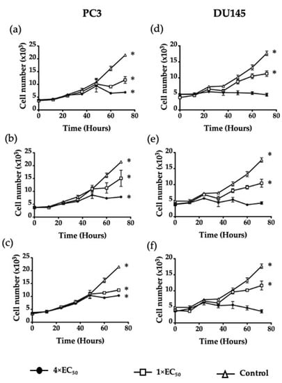Time-course cytotoxicity analysis in prostate cancer cells. PC3 cells were treated with (a) SAHA, (b) Jazz90, and (c) Jazz167, and DU145 cells were treated with (d) SAHA, (e) Jazz90, and (f) Jazz167 at concentrations of 1× EC50 and 4× EC50 for 0–72 h. Control cells were treated with 0.5% DMSO. Cell number was measured using the SRB assay. Symbols indicate cell number ± S.E.M from three independent experiments performed in triplicate. Data were analyzed using a two-way ANOVA coupled with Bonferroni’s post hoc test; * indicates significant differences compared to the start of the experiment, p < 0.05.