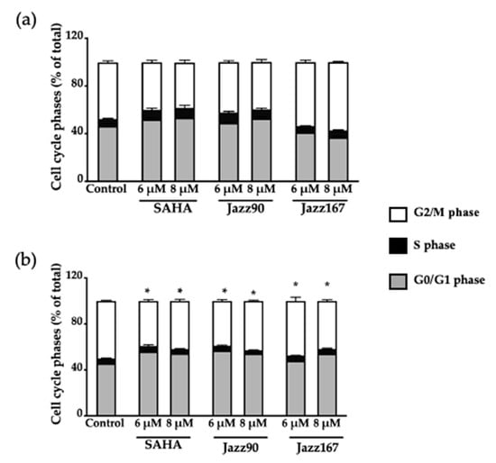 Cell cycle phases of DU145 cells at different time-points. DU145 cells were treated with SAHA, Jazz90 and Jazz167 at concentrations of 6 and 8 µM for (a) 24 and (b) 48 h. Vehicle control cells were treated with 0.5% DMSO. Cell cycle phases were measured using flow cytometry. Bars represent the mean ± S.E.M. of percentage of cells in each of the cell cycle phases (G0/G1, S, and G2/M phases) from three independent experiments. Data were analyzed using a two-way ANOVA coupled with Bonferroni’s post hoc test. * indicates G0/G1 significantly different from the control, p < 0.05.