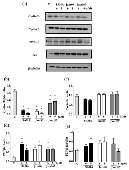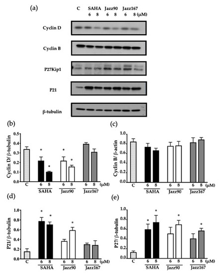 Cell cycle protein expression in PC3 cells. Cyclin D, cyclin B, p27kip1 and p21 levels were assessed in response to SAHA, Jazz90, and Jazz167 in PC3 cells at concentrations of 6 and 8 µM for 24 h. Vehicle control cells (C) were treated with 0.5% DMSO. Cell lysates were analyzed using Western blotting and β-tubulin was used as the loading control. (a) Representative blots for each of the proteins. Scanning densitometry graphs for (b) cyclin D, (c) cyclin B, (d) p21, and (e) p27kip1 are depicted. Bars represent the means ± S.E.M. from three independent experiments. Data were analyzed using a one-way ANOVA coupled with Bonferroni’s post hoc test; * indicates significant differences relative to the control, p < 0.05.
