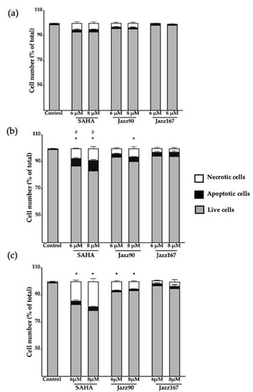 Analysis of apoptosis and necrosis in PC3 cells. Cells were treated with SAHA, Jazz90 and Jazz167 at concentrations of 6 and 8 µM. Vehicle control cells were treated with 0.5% DMSO. Cells were harvested at (a) 24, (b) 48, and (c) 60 h, after which the cells were stained with Annexin V and PI, and analyzed by flow cytometry. Bars represent the mean proportion of live, apoptotic and necrotic cells ± S.E.M. from three independent experiments. Data were analyzed using a two-way ANOVA coupled with Bonferroni’s post-hoc test; * indicates significant differences in necrotic cells relative to the control, p < 0.05; # indicates significant differences in apoptotic cells relative to the control, p < 0.05.