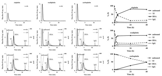 The quantification of Pt–protein adducts is necessary for assessing the dose-dependent response to treatment of individual patients. After identification of the major binding proteins in blood, quantitative analysis of the binding becomes possible. For example, a novel method was developed by Janez et al. for speciation of Pt in human serum []. The separation was based on affinity and ion exchange (IE) chromatographic modes using isocratic elution. A conjoint liquid chromatograph was constructed by placing one Protein G and one diethylamino (DEAE) disk in a single housing, thus enabling rapid two-dimensional separation of unbound Pt-based drugs and their complexes with proteins in human serum using a single injection. Separated Pt species were monitored online by ultraviolet (UV) and ICP-MS detection via isotope dilution (Figure 2). Compared with conventional 2D chromatographic separation method, which usually consists of SEC and IE, it was faster and simpler with satisfactory sensitivity, selectivity, method repeatability, and Pt recovery. Thus, it was subsequently used for the speciation of Pt in different samples, including the in vitro investigation of the interaction kinetics of cisplatin, carboplatin, and oxaliplatin with serum proteins and the distribution of Pt in spiked human serum (Figure 2). Kinetic studies showed that cisplatin and oxaliplatin react faster with serum proteins than carboplatin. Distribution studies showed that most of the Pt was bound with HSA, while IgG and Tf only accounted for small portions; the binding proteins were identified through a comparison with standard proteins reported as targets of platinum drug in serum. It is worth noting that these are high-abundance proteins in serum. The developed method could be useful for preclinical and clinical studies of the interaction and distribution of metallo-drugs with proteins in blood. Later, Larios et al. used a similar method to detect and accurately quantify adducts of plasma/serum proteins with carboplatin, and a similar distribution of Pt on serum proteins was obtained []. The reference methodology requires the usage of a Pt–HSA adduct calibrant with natural Pt isotopic composition and a 194Pt–HSA spike, which could be very useful for clinic analysis.