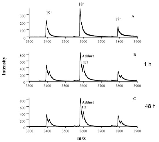 Analysis of erythrocyte samples from patient 1, who was undergoing oxaliplatin treatment, showing in vivo formation of intact Hb–oxaliplatin adducts. Spectra were obtained from erythrocytes of a healthy volunteer (A) and erythrocytes from blood samples of patient 1 collected at 1 (B) and 48 h (C) after the first infusion of oxaliplatin. Reprinted with permission from []. Copyright American Association for Clinical Chemistry 2005.