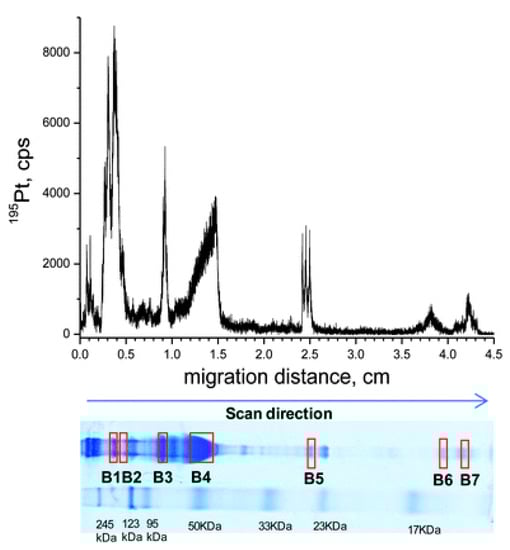 To identify the binding proteins of cisplatin in the serum of living animals, Gordaliza et al. developed a new method. Generally, the proteins were separated via gel electrophoresis, and the platinum-containing proteins were detected using LA–ICP-MS, followed by subsequent proteomic analysis of the band using nLC–ESI-linear ion trap quadrupole (LTQ)-Fourier transform (FT)-MS/MS []. Two-dimensional gel electrophoresis separation was performed under non-reducing conditions; then, Coomassie brilliant blue (CBB) or silver staining was used to show the protein bands, thus achieving a good resolution. Subsequently, LA–ICP-MS analysis was conducted to indicate the Pt-containing band, and the results showed that the platinum signal from glycerol-treated dry gels was stronger compared with that from blotted membranes. Using optimized conditions, four platinum-bound proteins, including ⍺-2-macroglobulin, transferrin, albumin, and hemoglobin, were identified in the serum of rats treated with cisplatin. Furthermore, the first complete metalloprotein profile was obtained through the use of two-dimensional gel electrophoresis with LA–ICP-MS. The CBB-stained gel is shown in Figure 4 with molecular weight markers. The bands used for protein identification are also marked on the gel with their 195Pt signals shown above. This method was also used to detect protein targets in cisplatin-incubated renal tubular epithelial cells.