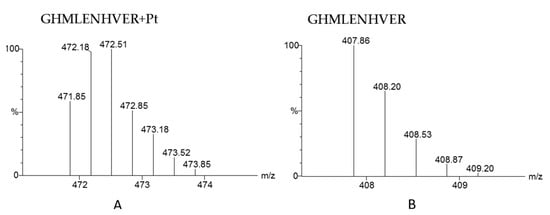 The theoretical MS spectra of platinated peptide GHMLENHVER (A) and the theoretical MS spectrum of peptide GHMLENHVER without Pt modification (B).