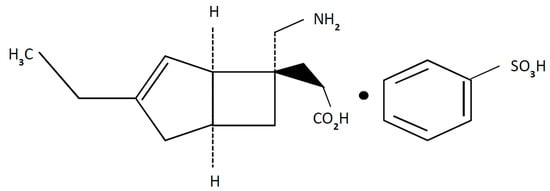 Mirogabalin besylate [(1R,5S,6S)-6-(aminomethyl)-3-ethylbicyclo(3.2.0)hept-3-en-6-yl) acetic acid] is a novel and unique ligand for the α2δ subunits of voltage-gated calcium channels (VGCCs) developed by Daiichi Sankyo for the management of peripheral neuropathic pain (PNP), including diabetic peripheral neuropathic pain (DPNP) and postherpetic neuralgia (PHN) (Figure 1) [4]. In January 2019 in Japan, mirogabalin tablets were approved for the usage of neuropathic pain relief based on trials conducted in DPNP and PHN patients [5]. The name of the mirogabalin product launched on the market is Tarliage, and the available dosage range is 2.5, 5, 10, and 15 mg. Currently, mirogabalin is also in clinical development for PNP in other Asian countries. Research has also been undertaken on the use of mirogabalin for other indications, for example, in fibromyalgia. However, clinical trials of mirogabalin for fibromyalgia-related pain were discontinued in the EU and the USA for the reason that the primary endpoint was not met in 3rd phase [6].