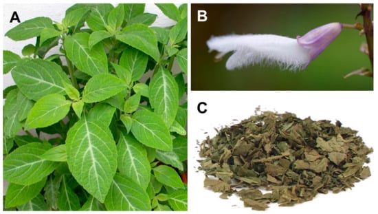 S. divinorum is a perennial herb, endemic to the forest ravines of Sierra Madre Oriental of Oaxaca, Mexico [27]. Large green leaves and flowers with purple calyces and white corollas can be seen in S. divinorum plants (Figure 1) [3]. A maximum height of 1.5 m can be reached by these plants, and the leaves can be 10–25 cm long and 5–10 cm wide [5]. Cultivation of S. divinorum is usually accomplished at altitudes ranging between 750 and 1500 m, under hot, moist, humid subtropical environmental conditions [28]. S. divinorum is mainly widespread in Mexico and South American countries. Although the plant produces viable seeds, this is not frequent [5], with propagation being accomplished through vegetative reproduction.
