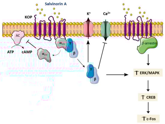 Additional downstream pathways can take place after KOP activation by salvinorin A, including β-arrestin 2-mediated signalling and extracellular signal-regulated kinase (ERK)/mitogen-activated protein kinase (MAPK) pathways (Figure 4), which can be responsible for the side effects arising from KOP activation (e.g., dysphoria, sedation, aversion) [114,115,120].