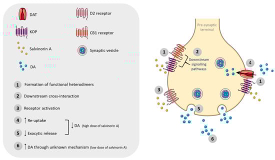 There is low consensus about the role of salvinorin A on the dopaminergic system (Figure 5). Nevertheless, salvinorin A was reported to interact and activate type-2 dopaminergic (D2) receptors in Sprague Dawley rat striatal tissue [131]. Activation of KOP has been associated with dysphoric effects in humans. Consistent with these effects, administration of salvinorin A (1.0 and 3.2 mg/kg, i.p.) to C57BL/6J mice resulted in a long-lasting, dose-dependent decrease in extracellular dopamine (DA) levels, for the low (30% decrease) and high (70% decrease) doses, in the caudate putamen [132]. Carlezon et al. [133] showed, in Sprague Dawley rats administered with salvinorin A (0.125–2.0 mg/kg, i.p.), a dose-dependent decrease in dopaminergic activation in the nucleus accumbens, the major brain structure involved in euphoria. Gehrke et al. [134] showed that acute systemic administration of salvinorin A (1.0 or 3.2 mg/kg, i.p.) to Sprague Dawley rats resulted in decreased dialysate extracellular DA levels in the dorsal striatum. Based on neurobiological studies, the decrease in extracellular DA may result from potentiation of DA re-uptake transporter (DAT) function by salvinorin A, which may be secondary to the formation of KOP/DAT heterodimers [135]. Other authors suggest that the pharmacological action is based on decreased DA release, without affecting the neurotransmitter uptake [134]. Conversely, small doses of salvinorin A (5–40 μg/kg, subcutaneous (s.c.)) led to the enhancement of DA dialysate levels, through a mechanism that is still not completely understood [129,136].