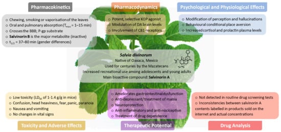 Herein, it is intended to comprehensively review the chemistry, pharmacokinetic and pharmacodynamic aspects of S. divinorum and its main psychoactive constituent, salvinorin A. With such a purpose, the psychological, physiological, and toxic effects induced by salvinorin A, as well as the available data on the pharmacology underlying possible therapeutic utility, will be covered. Information about its legal status, prevalence, patterns of use, and forensic relevance will be also included.