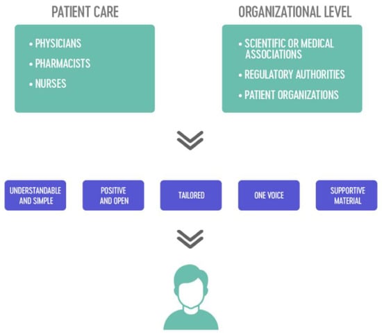 A tailored approach was already pointed out earlier in this review in the context of direct communication of HCPs towards patients. The specific biosimilar concepts that should be explained by HCPs will therefore vary from patient to patient, depending on the individual needs and level of understanding. It used to be common practice that the basic concepts about biological medicines, and biosimilars in particular (e.g., definitions, safety, efficacy, regulatory approval, etc.), have to be clearly explained to patients when transitioning to a biosimilar [20,60,74]. However, nowadays current practice has evolved towards providing the message that another brand of the same medicine will be used, with the same efficacy and safety outcomes at a lower cost.