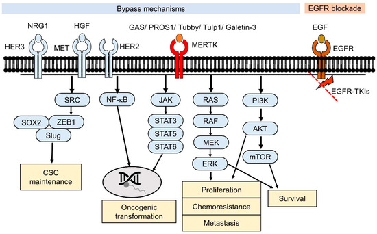 Effects of the Mer receptor tyrosine kinase (MERTK)-mediated signaling pathway in epidermal growth factor tyrosine kinase inhibitors (EGFR-TKI) resistance. For EGFR-TKI resistance without the acquired T790M mutation in EGFR, the downstream signaling pathways of EGFR are still blocked by EGFR-TKIs. Alternative RTK-mediated signaling pathways (bypass) contribute to the survival of the EGFR-TKI-resistant cancer cells. Through binding to their ligands, MERTK-induced signaling pathways may crosstalk with other RTK-mediated signaling pathways that promote cell survival.
