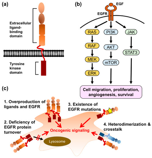 The binding of EGFR to its ligands, which are characterized by a consensus EGF motif containing six spatially conserved cysteine residues (CX7, CX4–5, CX10–13, and CXCX8) [37], induces the dimerization of two EGFR monomers. In the dimeric state, 12 of 20 tyrosine residues in the intracellular domain of each monomer are trans-phosphorylated and bind to downstream effectors, such as Shc1 and Grb2 [38], leading to the activation of several signaling pathways, including Ras/Raf/MAP kinase, PI3K/Akt, JAK/STAT, and phospholipase Cγ [39]. EGFR-mediated signaling pathways regulate various cellular functions in cancer cells, including cell migration, proliferation, angiogenesis, and survival [39]. The overactivation of EGFR and downstream signaling pathways in cancer cells can be triggered by different mechanisms, such as the overproduction of ligands and EGFR proteins; deficiency of EGFR protein turnover; existence of EGFR mutations, which cause the constitutive activation of EGFR; and cross-talk with alternative cell-surface receptors [40].