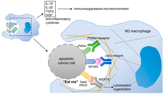 Phagocytosis is a cellular process for removing infectious microbes, foreign substances, and apoptotic cells by macrophages. In cancer, monocytes and macrophages are recruited to the tumor microenvironment, through a process guided by the tumor or stromal cell-derived chemokines (Figure 7). The infiltrated monocytes differentiate into macrophages and acquire a specific tumor-associated macrophage phenotype. Most of the tumor-associated macrophages resemble M2-like macrophages. Unlike M1-like macrophages with pro-inflammatory and anti-cancer activities, the M2-like macrophages function as immunosuppressive cells contributing to tumor initiation, angiogenesis, drug resistance, and metastasis [147,148]. The M2 macrophages help the immunosuppressive microenvironment by releasing anti-inflammatory cytokines, such as IL-20, TGF-β, and HGF [149], or by preventing the release of intracellular antigens from apoptotic cancer cells via efferocytosis [150].