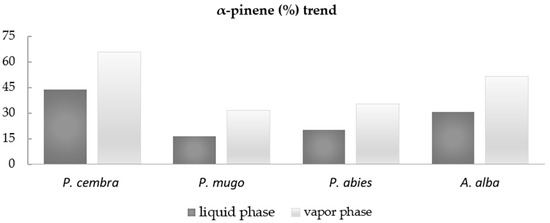 Among the most abundant compounds, particular attention was paid to α-pinene, as it always reached higher percentages in the vapor phase than in the liquid phase of the investigated EOs. The compared values are as follows: (44.0% vs. 65.6%), (16.6% vs. 31.6%), (20.2% vs. 35.5%), and (30.8% vs. 51.3%) liquid and vapor phase in P. cembra, P. mugo, P. abies, and A. alba EOs, respectively (Figure 1).