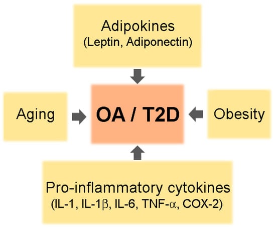 In conclusion, low grade inflammation, oxidative stress, and dysregulation of cell function mediated by aging, obesity, and hyperglycemia are common risk factors for OA and T2DM, suggesting a strong relationship between the two diseases [97,98].