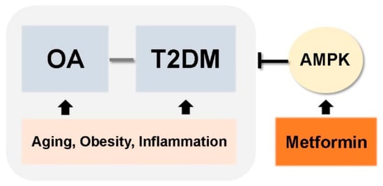Osteoarthritis (OA) and type 2 diabetes mellitus (T2DM) are common chronic diseases worldwide. About 237 million people, or 3.3% of the world’s population, suffer from OA, a condition that is much more common in older individuals [1,2]. About 10% of males and 18% of females over 60 years-of-age are affected. The main symptoms are joint pain and stiffness, caused mainly by cartilage degradation [3]. Rates of T2DM have increased markedly since 1960; indeed, 12% of adults aged 20 years and above, and 26% of those over 65, are affected [4]. T2DM is associated with long-term complications such as heart disease, stroke, blindness, and kidney failure, all of which can reduce life-expectancy by up to 10 years [1,5]. Co-existence of OA and T2DM in aging people is common, and those with T2DM seem to be more susceptible to developing OA. Piva, S.R. et al., 2015 study in adults aged 18–64 years showed that the prevalence of arthritis in those with T2DM was 52%, whereas as that in those without T2DM was 27% [6]. Although the molecular mechanism(s) underlying the high prevalence of OA in those with T2DM is not clear, OA and T2DM share risk factors such as aging and obesity. Metformin is the first-line mediation treatment for T2DM. The anti-diabetic effects of this drug are mediated via activation of AMP-activated protein kinase (AMPK) due to blockade of the mitochondria respiratory chain, resulting in an increased AMP/ATP ratio [7,8]. Since the incidence of OA in patients with T2DM increases with age, development of the effective medications for the prevention and treatment of the two diseases is necessary. In this review, we discuss common risk factors for OA and T2DM, along with the molecular mechanism(s). We also discuss preclinical/clinical application of metformin in those with OA.