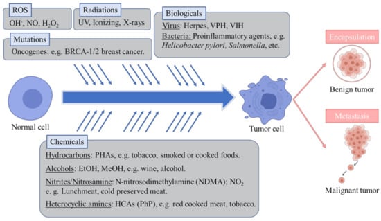 Cancer is one of the deadliest diseases globally and especially in western countries. According to the International Cancer Observatory, roughly 9.9 million people have died in 2020 as a result of developing cancer [1]. Cancer is a complex disease, generally defined as an uncontrolled proliferation and development of cells in tissues forming an amalgamation and microenvironment (tumor) that may potentially expand to a whole organ or systemically to other tissues (metastasis) [2]. This abnormal cell behavior may be the result of hereditary genetics, or an epigenetic-driven alteration of key genes (oncogenes) related to the cell cycle and regulation of cell death (apoptosis) [3]. Cancerous cells are also characterized by dysregulation of programmed apoptosis and aberrant behavior of microtubules, as they are involved in the mitotic process [3]. The World Health Organization identifies as main causes behind the development of cancer random somatic mutations, ionizing radiation, reactive oxidative species as well as several chemical and biological agents [4]. Except for random mutations, these are widely recognized exogenous carcinogens. Ionizing radiation is able to disrupt the hydrogen bonds between nucleic acids as well as altering their chemical conformation, which may yield alterations in normal DNA expression regulation [5]. Infectious diseases caused by bacteria, fungi or viruses have also been significantly correlated with developing cancer afterward in the same affected tissues. Well-established associations between infections and cancer are viruses like human papillomavirus to cervix cancer, Herpesvirus to Kaposi’s sarcoma or Hepatitis B and C to liver cancer. In the same sense, bacterial infections by Helycobacter pylori are linked to gastric cancer or the genus Salmonella to colon or gallbladder cancer development post-infection [6]. Viruses that integrate their genetic material into the host may alter normal expression of genes related to cell division or even induce expression of oncogenes that could derive into oncogenesis. Some examples of these are the integration of Hepatitis B virus into telomeres, as well as genes coding for proteins X and S, which induce inflammation and neoplasia; or Human Papilomavirus integration in oncogenes E6 and E7 in the cell genome, which suppress the p53 anti-tumor gene and promote cell proliferation while simultaneously alters cell-to-cell adhesion [7,8,9]. These oncogenes have been related to increased release of inflammatory mediators like necrosis factor kappaB (Nf-κB) or Activator protein-1 (AP-1) [8]. Conversely, bacterial infections may elicit the release of toxins with cytotoxic activity and the disruption of the tissue cell matrix. Known examples are enteric toxins from S. typhi or CagA and vacuolating toxins of H. pylori, which may induce cell death, neoplasia, and also alterations in the normal cell metabolism [10,11]. Other infectious pathogens like fungi and parasitic helminths that produce direct or toxin-mediated tissular damage are also accounted as oncogenic agents [12]. Aside from specific genetic alterations, the main recognized tumor-inducing mechanism of biological agents is tissue inflammation as a result of cell damage and subsequent neoplasia which, if unchecked, can result in potential chronic inflammation of the affected tissues (e.g., hepatic cirrhosis by Hepatitis virus) [7,13]. Regarding reactive oxygen species, like hydroxide peroxide or hydroxyl radical, which are normal metabolic products but also arise from contact with oxygen, they are described to provoke damage and alterations of the cell membranes, lipids or DNA [14]. Indeed, reactive oxygen species have been identified to increase in tumorous cells, enhancing their proliferation and survivability [15]. Nonetheless, the common factor besides possible genetic alterations by oxidative stress, infections and ultraviolet radiation is the associated inflammatory response [12,14]. On this matter, chronic inflammation is considered both cause and symptom of other ailments, but particularly of cancer, as tumorous cells secrete several pro-inflammatory molecules [16]. For example, it is well known that the pro-inflammatory mediator cyclooxygenase-2 (COX-2) is overexpressed in several types of cancer. As such, pro-inflammatory mediators are markers of cancer and could be also a possible target for anticancer therapies [17,18]. Considering chemical carcinogens aside from potential hazardous substances, the main carcinogens originate in diet. Major chemical carcinogens include polycyclic aromatic hydrocarbons (PAHs), N-nitroso compounds, heterocyclic amines (HCAs) and alcohol. PAHs like anthracene appear in combustion reactions, and are reported in grilled or smoked foods, as well as being part of urban air pollution. They are linked to lung and digestive tract cancer [19,20]. Closely related in their effects and occurrence, HCAs like 2-Amino-1-methyl-6-phenylimidazo [4,5-b]pyridine are the result of pyrolysis of proteins and amino acids in meat or fish foods [21,22]. It is worth mentioning that tobacco is reported to contain high levels of PAHs and HCAs, linking them to the pro-carcinogen effects of tobacco consumption [23]. N-nitroso compounds are additives in processed meats and include nitrites and nitrosamines like N-nitrosedimethylamine that have been correlated to gastric cancer development [24]. Ethanol as well as other alcohols present in beverages and spirits induce many metabolic and endocrine disorders along with being highly cytotoxic chemicals and attributed to cause many types of cancers [25]. Altogether, it should be considered that a variety of exogenous carcinogens from different sources can heavily prompt cancer development (Figure 1).