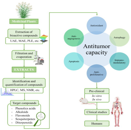 The ever-growing interest in the search of new therapeutic compounds against cancer has pushed researchers to look for innovative sources of anticancer compounds in natural sources, including plants [31]. Traditionally, plants have been used in all cultures for healing diverse diseases and improve well-being [32,33]. Further research demonstrated that traditional-used plants contain bioactive compounds, which administered in sufficient doses, have positive effects on health. These effects are attributed to the biological properties of the compounds, such as antioxidant, anti-inflammatory, antimicrobial and also anticancer. Nowadays, the potential of plants as sources of anticancer compounds is both well recorded in traditional medicine and experimental findings [34]. In several cases, phytochemical compounds have been directly employed or chemically modified to develop chemicals used in modern medicine, including anticancer drugs. According with the Food and Drug Administration (FDA), more than the 60% of the drugs employed in cancer treatment are obtained from natural resources [32]. In Figure 2, a schematic process for the development of anticancer drugs based on phytochemical compounds is presented. Briefly, this process starts with the extraction from plants and the testing of the extracts to evaluate their anticancer potential. Bioactive compounds of the extract are identified, purified and tested in pre-clinical studies, (both in vitro cell cultures and in vivo animal models) and later clinical trials in humans [35]. In these studies, some factors such efficacy, induced tumorigenic changes, possible side effects and toxicity factors must be deeply characterized [30]. Vinka alkaloids, taxanes, and camptothecin are some examples of compounds that are currently clinically employed.
