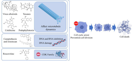 In this group of molecules, the most recognized compound is paclitaxel, one of the most effective and promising therapeutic drugs available against a wide range of cancers. This compound has been identified in different species of the genus Taxus such as Taxus brevifolia, T. baccata, T. media or T. cuspidate [59]. It is an anti-neoplastic agent which acts as a microtubule’s stabilizer and mitosis inhibitor. Its main antitumor effect is derived from the compound binding the β-sub-unit of tubulin, which inhibits the microtubule depolymerization into tubulin and stops the cell cycle in the G2/M phase, leading to cell death [60].