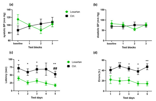 The study was performed using double transgenic APP/PS1(APPswe/PS1dE9) male mice obtained from Jackson Laboratories (Bar Harbor, ME). Animals were housed individually with controlled temperature and an artificial light/dark cycle. Food and water were available ad libitum. All animal experiments were performed in accordance with the guidelines of the University of Tübingen for the experimental use of animals and German law for the protection of animals. All experiments were approved by the local Animal Protection Committee, University of Tübingen (approval code: PH1/06). Seven month-old mice were divided into losartan- (n = 9) and vehicle (0.9% NaCl)-treated (n = 8) APP/PS1 groups. Blood pressure was measured one week before starting the treatment (baseline in Figure 1a,b) and during the last 3 weeks of losartan administration (test blocks 1–3 in Figure 1a,b) by the tail cuff method using a blood pressure analyzer (Hugo Sachs, March-Hugstetten, Germany), as described elsewhere [7]. Losartan (MSD, Haar, Germany) dissolved in 0.9% NaCl was applied intraperitoneally (10 mg/kg body weight) every other day for a period of 1 month. On day 31, the mice were euthanized and the brains were frozen at −80 °C for further processing, as described below.
