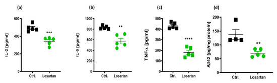 Multiplex analysis of interleukin-a, IL-1b, IL-2, IL-4, IL-5, IL-6, IL-10, IL-12, tumor necrosis factor α (TNFα), interferon γ (IFNγ), and granulocyte-macrophage colony stimulating factor (GM-CSF) in the brain homogenates of APP/PS1 mice revealed that only IL-2, IL-6 and TNFα were significantly decreased by losartan treatment (Figure 2a–c), while the remining factors (data not shown) were below the detection range in the used test in both treatment groups.