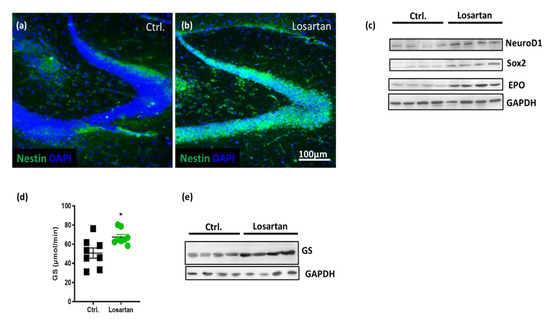 Losartan-mediated changes in neurogenesis and neuroprotection markers in APP/PS1 mice. (a,b) Expression of nestin (green) in the hilus and granular cell layer of the denate gyrus in brain sections of losartan vs. vehicle (Ctrl.) treated APP/PS1 mice. Cell nuclei are stained with 4´,6 diamidino-2-phenylindole (DAPI, blue), scale bar shown in (b) corresponds to the images shown in (a) and (b). (c) Cerebral content of Neuronal Differentiation 1 protein (NeuroD1), SRY-related HMG-box 2 (Sox2) and erythropoietin (EPO) assessed in brain homogenates of APP/PS1 mice (n = 4) by Western Blot. (d,e) Enzymatic activity (n = 8) and expression level of glutamine synthetase (GS) in brain homogenates of losartan and vehicle (Ctrl.) treated APP/PS1 mice (n = 4). Statistical analysis in (d): t-test, * p < 0.05.