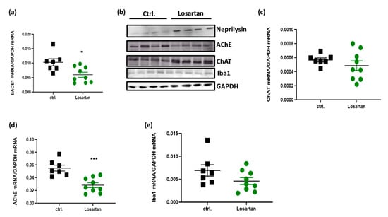 Expression of factors regulating cholinergic activity, Aβ clearance and microglial function in losartan-treated APP/PS1 mice. (a) qPCR of β secretase 1 (BACE1) mRNA (n = 7 in control and n = 9 in losartan treated group); (b) Western blot of neprilysin, Acetylcholine esterase (AChE), Choline acetyltransferase (ChAT) and ionized calcium-binding adapter molecule 1 (Iba1), n = 4; (c–e) qPCR of AChE, ChAT and Iba1 mRNA (n = 7 in control and n = 9 in losartan treated group). Statistical analysis in (a) and (c–e): t-test, * p < 0.05, *** p < 0.0005.