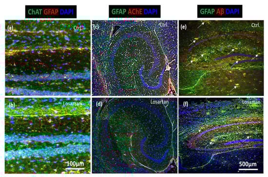 Consistent with the results from qPCR and Western Blots of cholinergic markers, as well as the assessment of Aβ42 by ELISA, immunofluorescent analyses of brain sections demonstrated a prominent increase in ChAT expression (Figure 5a,b), whereas AChE and Aβ plaques were markedly reduced in losartan treated animals in comparison to the vehicle treated controls (Figure 5c vs. Figure 5d and Figure 5e vs. Figure 5f, respectively).