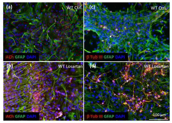 Losartan-induced neurogenesis and ACh production in wild type (WT) astroglial primary cultures (APC). (a,b) Immunofluorescent analysis of GFAP (green) and ACh (red) in losartan vs. vehicle (Ctrl.) treated WT APC. (c,d) Expression of β tubulin III (red) and GFAP (green) in losartan/vehicle treated WT APC. Arrow in (d) indicates young β tubulin III positive neuron in losartan treated culture. Cell nuclei are stained with DAPI (blue), scale bar in (d) corresponds to the images shown in (a–d). (a–d) Representative images out of n = 4 cover slips stained with ACh/GFAP or β tubulin III/GFAP in each treatment condition.