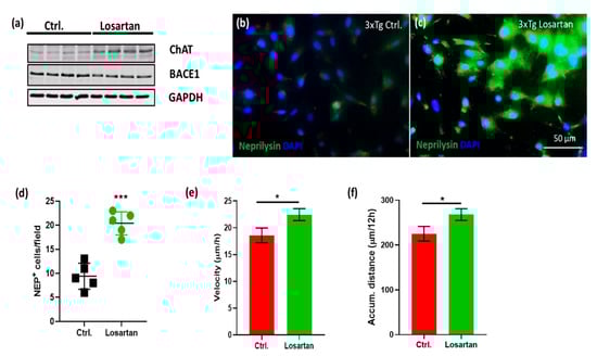 In vitro effects of losartan on triple transgenic Alzheimer’s disease (AD) mice (3xTg-AD) APC. (a,b) Western Blot of ChAT and BACE1 in losartan vs. vehicle (Ctrl.) treated 3xTg-APC. (b,c) Expression of neprilysin (green) in losartan (3xTg losartan) and vehicle (3xTg Ctrl.) treated 3xTg-APC. Cell nuclei are stained with DAPI (blue), scale bar in (d) corresponds to the images shown in (b,c). (d) Quantification of neprilysin positive cells in 3xTg-APC (n = 5). (e) Velocity of migrated cells in the control (ctrl.) and losartan treated 3xTg-APC. From the cells shown in videos in Supplementary Figure S1, we identified and analyzed 32 cells per treatment group (n = 32) which were trackable for at least 12h; (f) accumulated distance calculated for cells described in (e); Statistical analysis in (d–f): t-test, * p < 0.05, *** p < 0.0005.