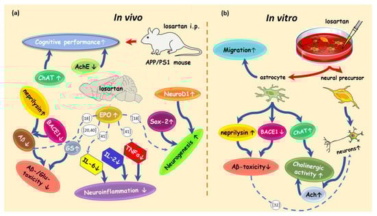 Schematic illustration of processes influenced by losartan in an AD-like pathology in vivo and in vitro. (a) In vivo effects of losartan in a transgenic model of AD (APP/PS1 mouse). Intraperitoneal administration of losartan led to a decrease in: Acetylcholine esterase (AchE), TNFα, IL-6, IL-2, β secretase 1 (BACE1), and beta amyloid (Aβ), and to an increase in Choline acetyltransferase (ChAT), glutamine synthetase (GS), neprilysin, SRY-related HMG-box 2 (Sox-2), Neuronal Differentiation 1 protein (NeuroD1) and erythropoietin (EPO). Blue solid arrows connect the processes (neurogenesis, neuroinflammation, cholinergic activity and Aβ/Glutamate (Glu)-toxicity) with their respective markers. Dashed blue arrows show the effect of EPO on GS, TNFα, IL-6 and neurogenesis evidenced by the literature indicated in white circles; (b) in vitro effects of losartan on the astrocytes and neural precursors. Losartan induced the differentiation of neurons from neural precursors, increased the Acetylcholine (ACh) in neurons, decreased the expression of BACE1 and upregulated ChAT and neprilysin in astrocytes. Losartan improved the motility and migration of astrocytes. This schematic drawing was created using art elements from Servier Medical Art Commons Attribution 3.0 Unported License. Servier Medical Art by Servier is licensed under a Creative Commons Attribution 3.0 Unported License.