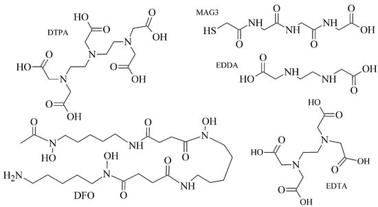 The polyaminopolycarboxylic acids-derived BFCA, such as DTPA, EDDA, EDTA, as well as tripeptide MAG3 (Figure 2), are the most commonly used acyclic BFCA containing hard donor atoms (N, O) in their molecule to form the coordination bond with metallic radionuclide. Another acyclic chelator, a siderophore-based desferrioxamine-B (DFO) has been utilized for effective radiolabeling of biomolecules with a metal. The thermodynamic stability and inert kinetics of a formed complex is unique and influenced by properties of both, a metal radionuclide as well as a BFCA. A significant advantage of the acyclic BFCA is faster metal binding kinetics, resulting in a faster radiolabeling procedure [17]. On the contrary, acyclic BFCA form less stable complexes than cyclic ones due to a higher interaction probability and more fixed geometry of donor atoms in the cyclic BFCA [18].