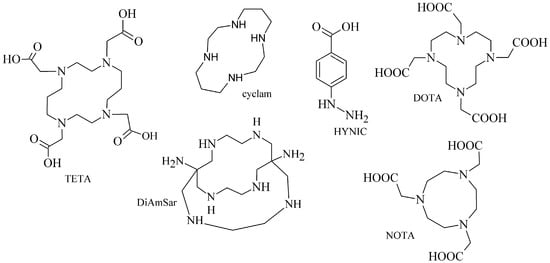 DOTA is considered as the golden standard of chelators owing to its high kinetic stability. Several types of DOTA-derived chelators have been developed to bind with target peptide biomolecules, i.e., protected DOTA forms, active DOTA esters, and DOTA- derivatives with a coupling moiety [20]. Concerning NOTA, derivatives with aminocarboxylic acids have been applied as BFCA, e.g., NODAGA (with glutaric acid), NODASA (with succinic acid), or NODAPA (with p-phenylacetic acid) [21]. Abrams and co-workers used 6-hydrazinopyridin-3-carboxylic acid, in short HYNIC, for radiolabeling of a polyclonal antibody with technetium-99m [22]. Ever since, HYNIC has become the most convenient chelator for 99mTc-labeled peptides and antibodies. Other chelators related to bisthiosemicarbazone [23,24], cyclam [25,26], and sarcophagine [27,28] have been increasingly studied to improve kinetic inertness and stability of complexes, especially those with copper isotopes.
