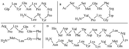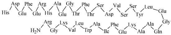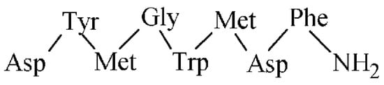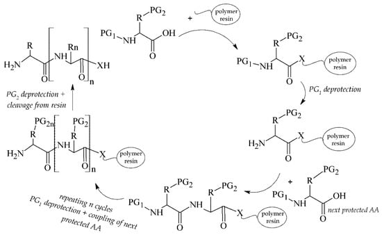 Peptides can be simply synthesized by a solid phase peptide synthesis (SPPS) [31,32] and modified to obtain optimized pharmacokinetic properties. The synthetic procedure can be carried out manually [33], e.g., in syringes, or automatically in commercial synthesizers [34]. A general pattern for the solid-phase peptide synthesis is depicted in Figure 4.