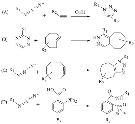 Selected click reactions for the preparation of intermediates used for metal chelating (R1, R2—proper chelating and peptide moieties). (A) CuAAC, (B) IEDDA, (C) SPAAC, (D) Staudinger ligation.