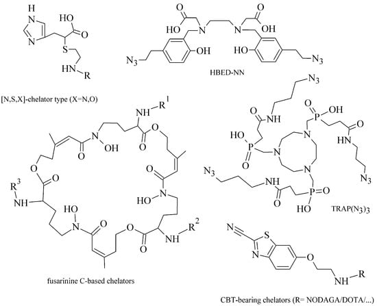For 68Ga- and 64Cu-labeled probes, standard BFCA have been modified using various prosthetic groups. The DOTA- and NOTA-based click chelators with aldehyde, alkyne, aminooxy, azide, maleimide, monofluorocyclooctyne, and thiol functionalities were developed using CuAAC or RIKEN click reaction [101,102,103,104]; or with azide and tetrazine prosthetic groups using SPAAC and IEDDA reactions [105]. The HBED-chelator was modified with two azide groups (HBED-NN) and both azide and carboxylic groups (HBED-NC) [106]. Novel cyclic hydroxamate siderophore-based BFCA were reported as promising BFCA for gallium-68 [107]. Baranyai et al. optimized a procedure for the conjugation of 1,4,7-triazacyclononane-1,4,7-tris(methylene(2-carboxyethylphosphinic acid)) chelator (TRAP) with peptides using CuAAC [108]. The TRAP conjugates showed kinetic inertness and suitability for 64Cu- and 68Ga-coordination [109,110].
