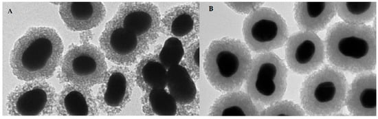 Representative image of PET-SERRS nanoparticles with non-optimized 68Ga-labeling (A) with visible degradation of silica shells and after the optimization (B) with improved stability of the silica shells [118].