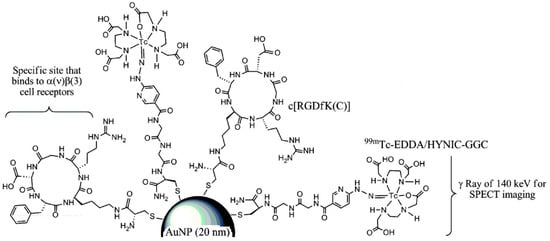 Illustrative scheme of [99mTc]Tc-EDDA/HYNIC-GGC conjugated to RGD derivative and gold NP [119].
