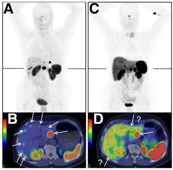 PET/CT images of a patient with ileal neuroendocrine tumors showing bilobar liver metastases (marked with arrows) after application of [68Ga]Ga-OPS202 (A) and its transaxial fusion image (B) and [68Ga]Ga-DOTATOC (C) and its transaxial fusion image (D) (adapted from [60]).