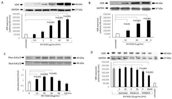 The expression of the VDR is controlled by extracellular-signal regulated kinase 1/2 (Erk1/2) mitogen activated protein kinase (MAPK) in muscle cells [18]. EPs® 7630 has been shown to differentially regulate Erk1/2 MAPK in immune cells, while suppressing protein 38) (p38) MAPK [19]. Hence, it seems feasible that EPs® 7630 could also affect VDR expression.