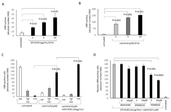 EPs® 7630 not only increased the overall expression of the VDR, but also induced its translocation into the nucleus (Figure 3A). However, this effect was much lower compared to calcitriol-induced nuclear accumulation of the VDR (Figure 3B). Both effects were concentration dependent. In untreated cells, the VDR was located mainly in the cytosol (Figure 3C). Calcitriol significantly increased the number of cells with nuclear VDR, and this was further increased when the cells were also treated with EPs® 7630 (10 µg/mL) (Figure 3C). When cells were treated with the combination of EPs® 7630 (10 µg/mL) and calcitriol, only Erk1/2 MAPK inhibition (PD98059) suppressed the accumulation of the VDR into the nucleus (Figure 3D).