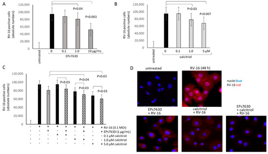The effect of EPs® 7630 and calcitriol on RV-16 infection in BEAS-2B cells. (A) Concentration dependent effect of EPs® 7630 on RV-16 staining in BEAS-2B cells. (B) Concentration dependent effect of calcitriol on RV-16 staining in BEAS-2B cells. (C) The effect of combined EPs® 7630 (fixed concentration) with calcitriol (increasing concentrations) on RV-16 staining on BEAS-2B cells. Bars represent mean ± SEM of triplicate experiments. (D) Representative immunofluorescence photographs of RV-16 positive primary epithelial cells in the presence and absence of EPs® 7630 (1 µg/mL), or calcitriol (1 µM), or the combination of both (EPs® 7630 1 µg/mL + calcitriol 1 µM).