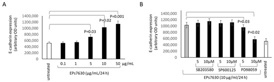 EPs® 7630 increases E-cadherin expression through Erk1/2 MAPK in BEAS-2B cells. (A) Concentration effect of EPs® 7630 on the expression of E-cadherin over 24 h in BEAS-2B cells. (B) The effect of inhibitors for JNK, p38, and Erk1/2 on EPs® 7630 induced E-cadherin expression. Bars represent mean ± SEM of triplicate experiments.