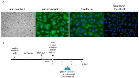 Cell characterization and treatment. (A) Cell type characterization by phase contrast microscopy and positive immunofluorescence pan-cytokeratin, E-cadherin, and fibronectin (negative control). (B) Treatment scheme of cells. Confluent epithelial cells were pre-treated with either EPs® 7630 for 24 h before calcitriol was added for another 24 h and prior to infection with 1 MOI RV-16. RNA and protein were isolated over 4 days. Non-infected cells were used to calculate changes of protein expression at the corresponding time points.